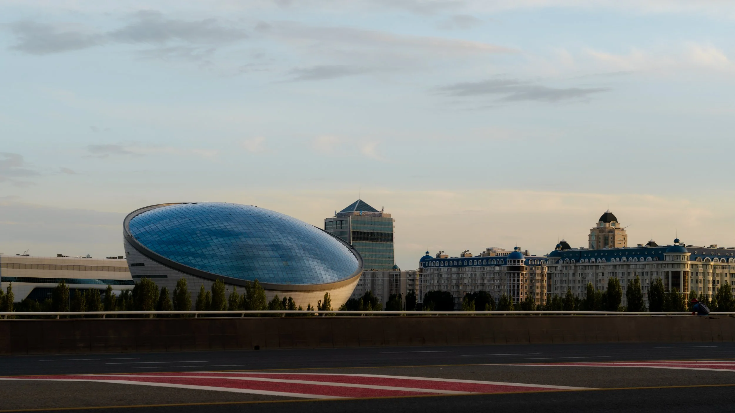 Saryarqa Republican Cycle Track in the distance. The arena resembles a bike helmet.