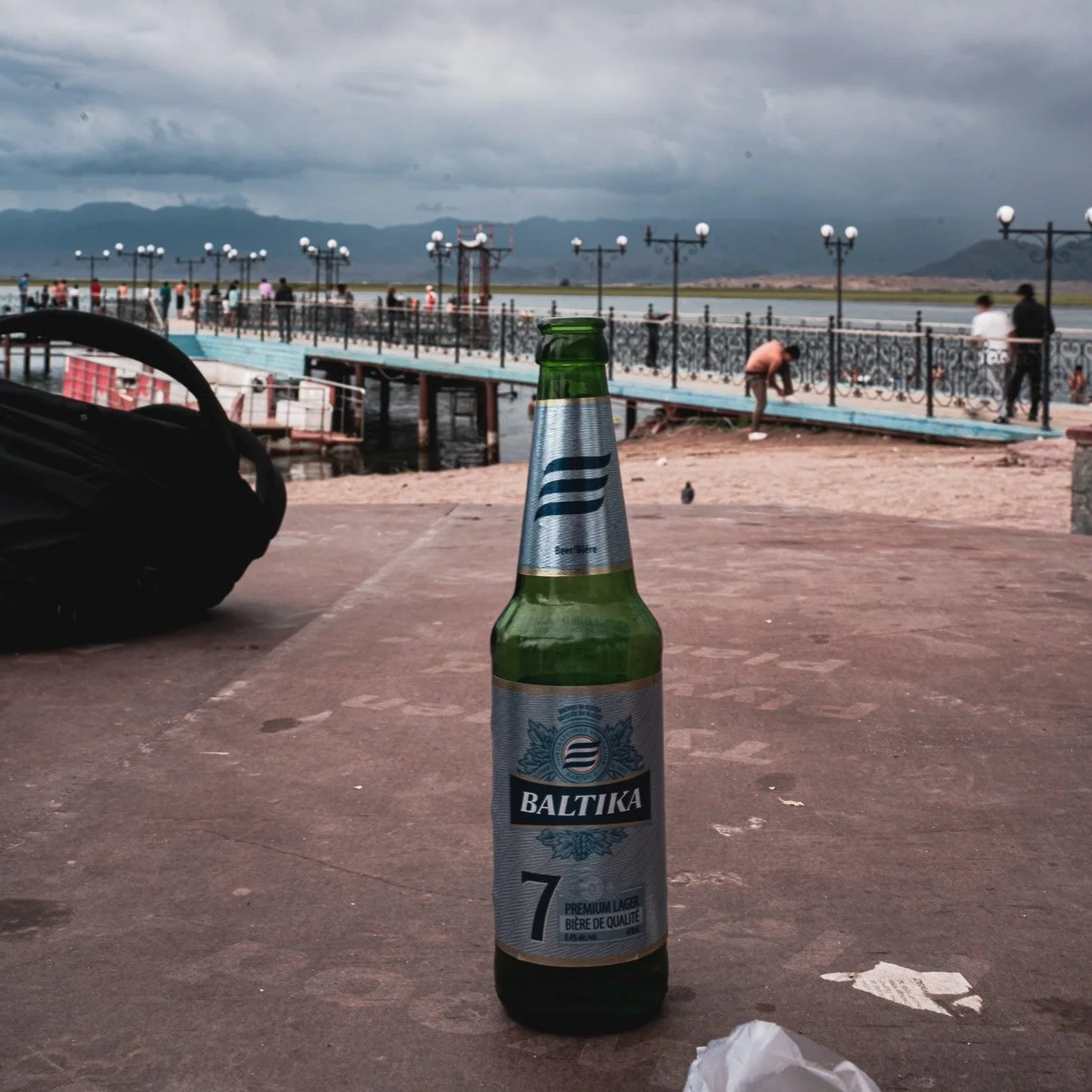 A public beach with an entry fee of 100 soms shares the shoreline with the port. A group of gentlemen listening to 50 Cent on the radio had noticed our entry and invited us over to talk. We had about an hour to spend before catching the departing train to Bishkek so we bought a round of Baltika brew and exchanged a couple of laughs with our new friends.