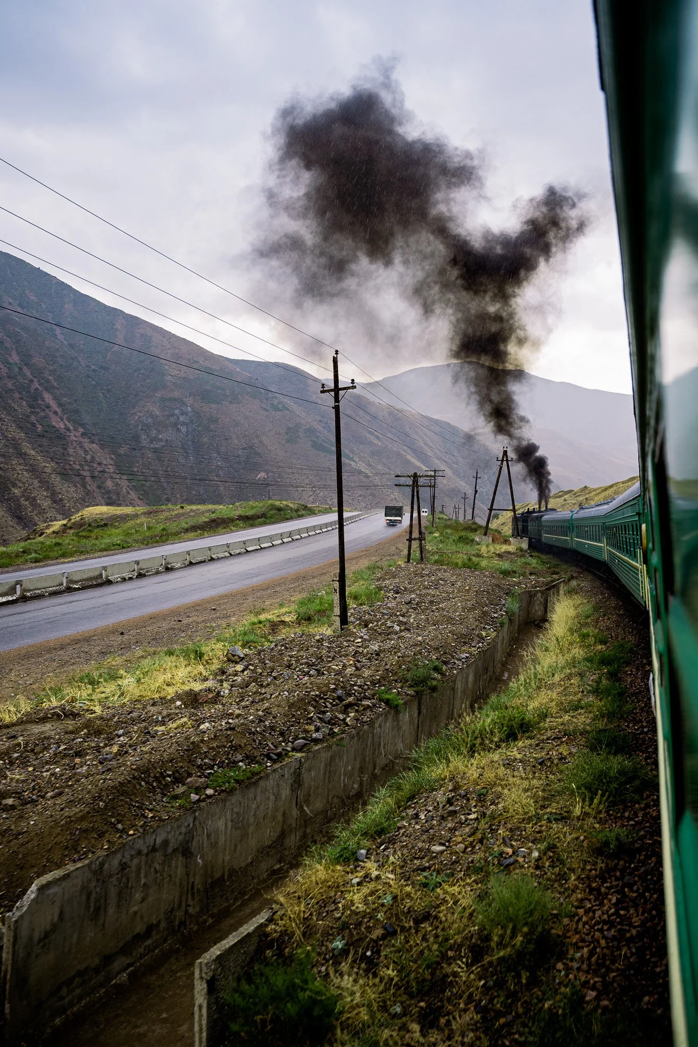 Passing through the Boom Gorge. The train operates its route to the lakeside town every day during the warmer months before the gorge becomes too dangerous to pass through via train. The tracks run alongside the A365 highway which is basically the only route between Bishkek and Lake Issyk-Kul.
